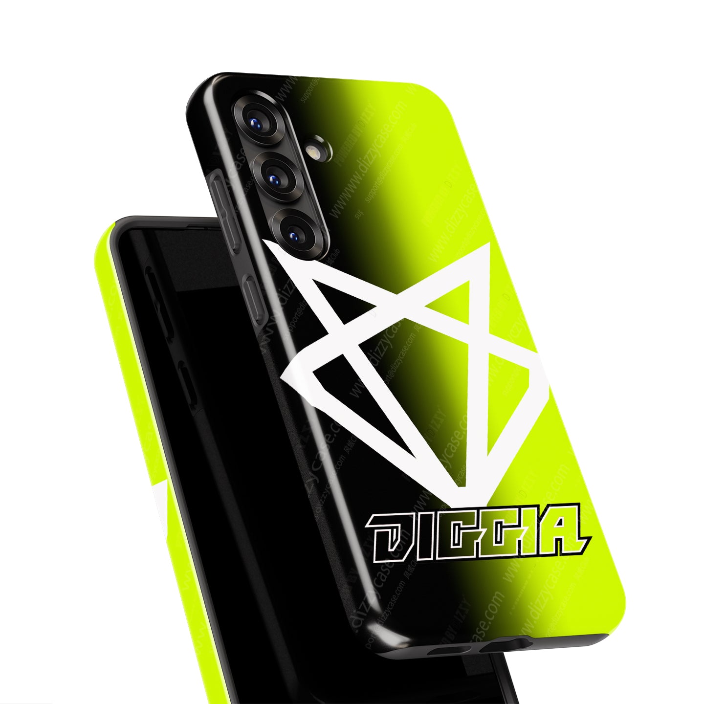 The geometric wolf head — Di Giannantonio's personal emblem — dominates the center of the case in white, straddling the line between light and shadow. Below it, the DIGGIA name in a custom racing typeface, outlined in neon yellow. It's minimal, bold, and hits harder than any sponsor-covered race livery.