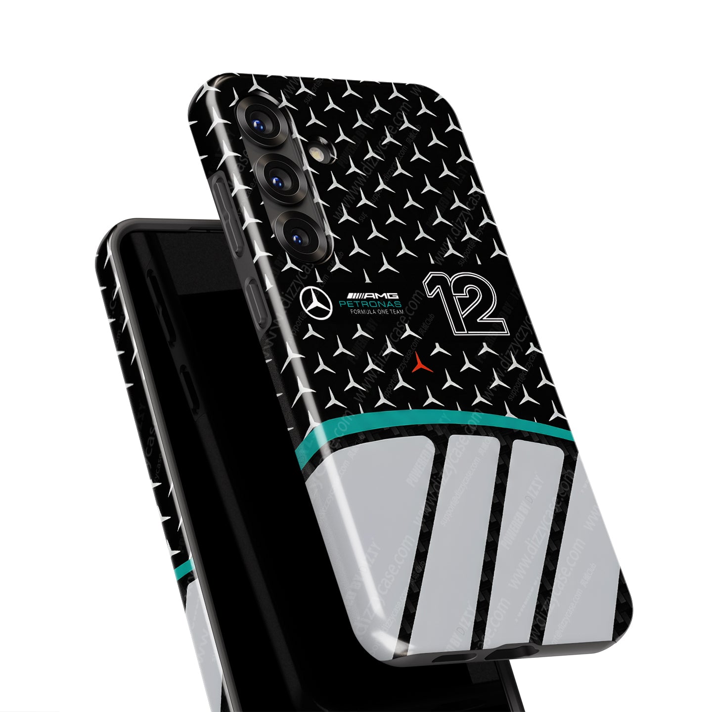 The design features the mesmerizing Mercedes "Three-Pointed Star" pattern, a symbol of automotive perfection. The neon Petronas Teal strip cuts through the silver and black, highlighting the #12—a number that fans will be watching for years to come. Whether you are upgrading to the new Samsung Galaxy S26 or sticking with your trusty S-series, this case transforms your device into a statement of faith in the next big thing.