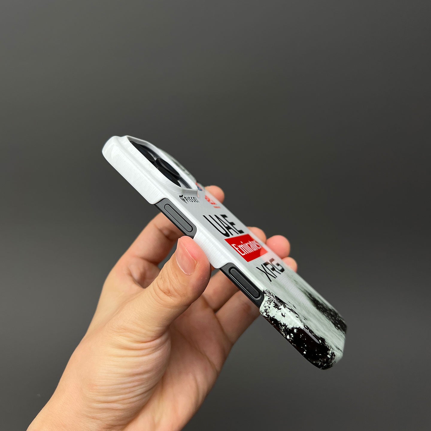 This phone case is inspired by the 2025 UAE Team Emirates Tour de France special-edition kit. Featuring a white fabric-texture base with dynamic black brushstroke effects, this design reflects strength, elegance, and national pride. The recognizable Emirates and UAE branding makes it a must-have for pro cycling enthusiasts and supporters of the powerhouse team.