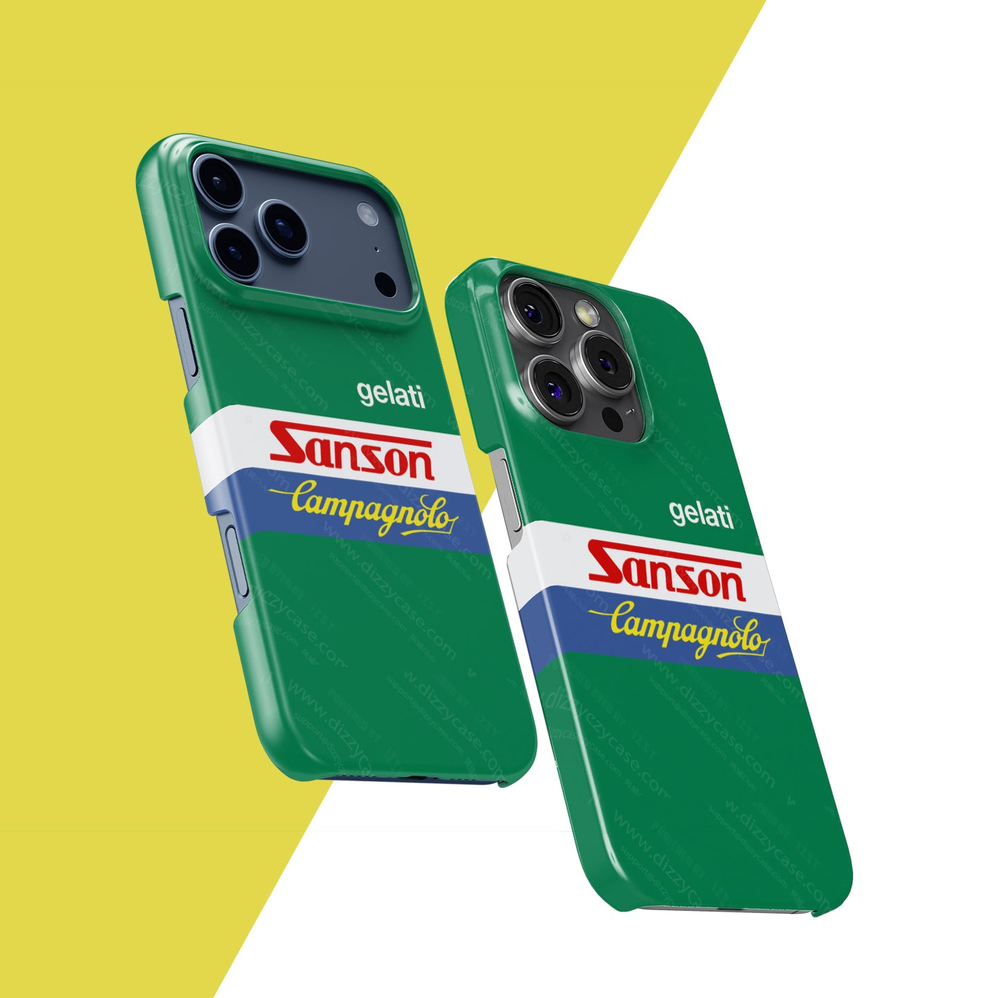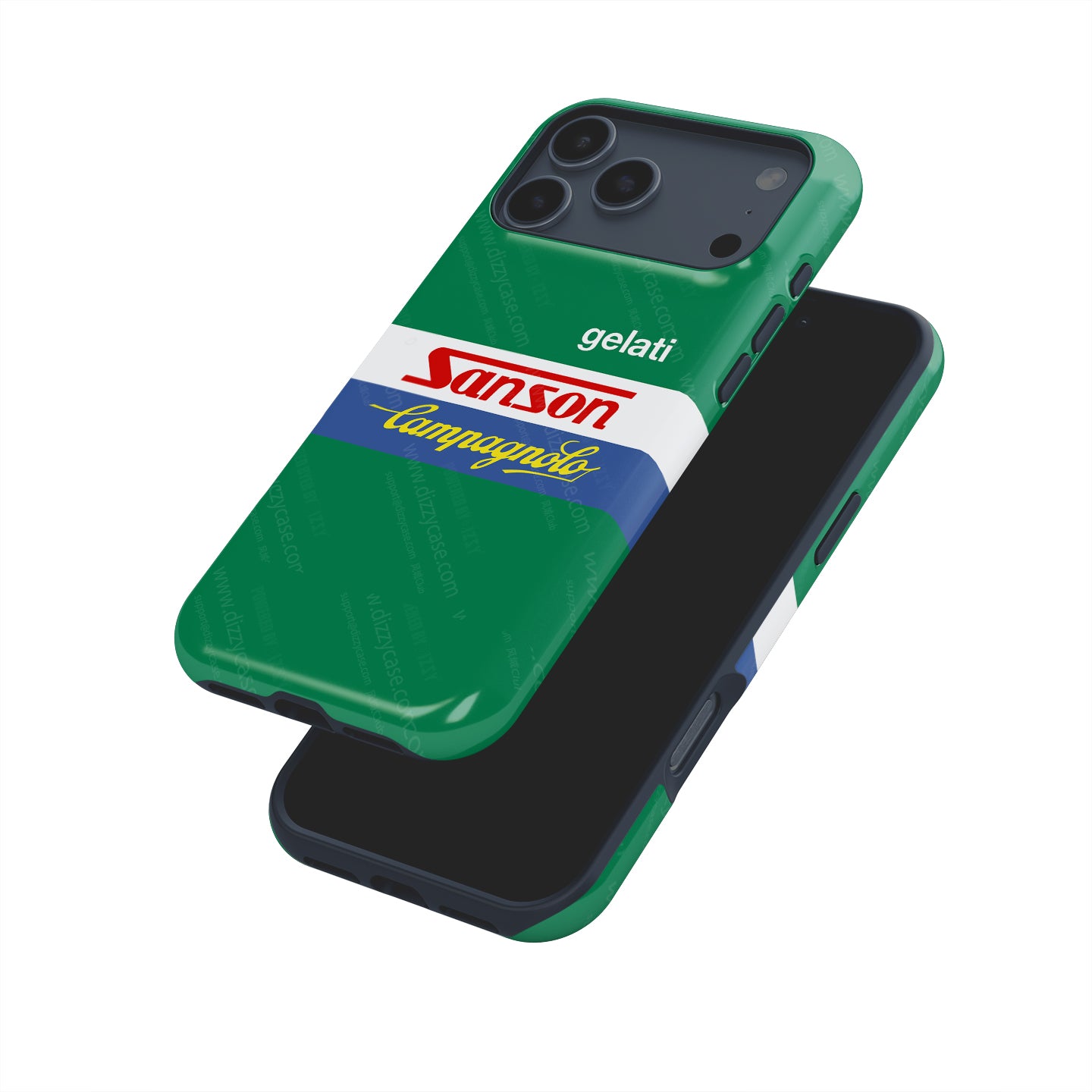 Crafted from tough polycarbonate material, our phone cases are built to withstand daily wear and tear while showcasing the timeless design of the Gelati Sanson Campagnolo cycling jersey. The high-quality, glossy finish is the result of a patented 3D printing process that embeds the iconic livery into the layers of the case. Whether you're an iPhone or Samsung user, we've got you covered with precise cutouts for easy access to buttons and ports. Choose between our slim, sleek Snap Case for minimal bulk or the Tough Case for full protection with added raised rubber inserts to guard your screen and edges.