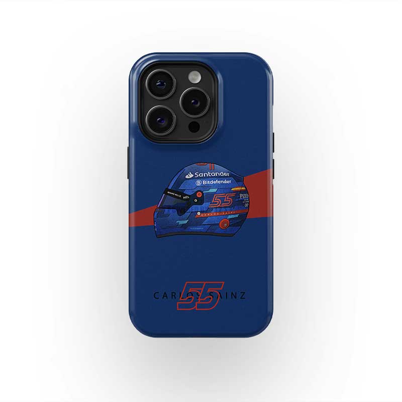 For those who demand extra protection, the Tough Case provides dual-layer defense. The inner shock-absorbing silicone layer cushions your phone against drops and impacts, while the outer polycarbonate shell shields it from scratches and wear. The stunning design of Sainz’s Miami Grand Prix helmet covers the case from every angle, making sure your phone is both safe and stylish. -
