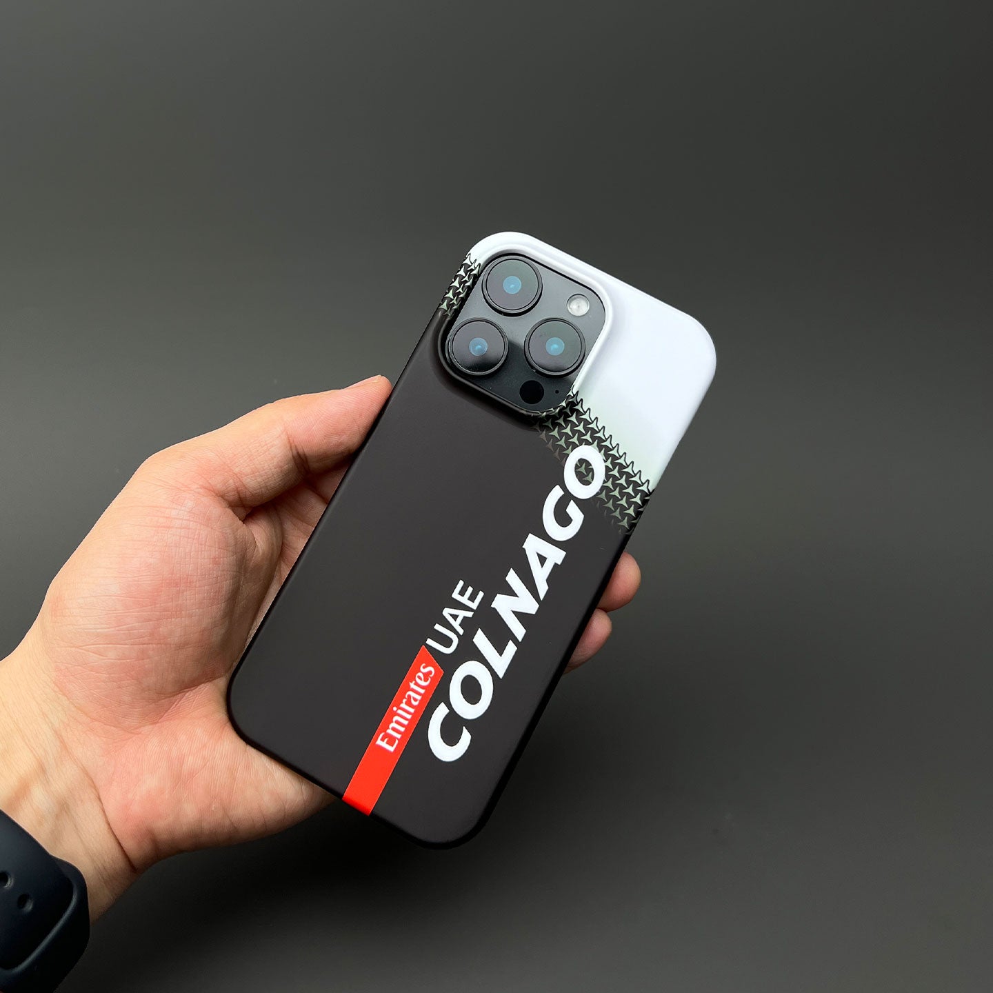 Inspired by a striking 2025 team edition livery of the Colnago Y1RS, this phone case embodies the clean contrast and technical sharpness of UAE Team Emirates’ race machines. The split-tone black-and-white design is accented by a textured Colnago pattern near the top, finished with a vertical red stripe for bold balance.