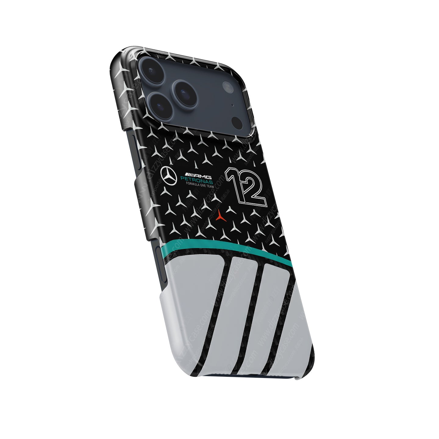 The design melds the heritage of Mercedes-AMG with the youthful energy of the #12. The classic "Star Pattern" fades from deep carbon into gleaming silver, symbolizing the transition from the old guard to the new. A flash of Petronas Teal highlights Antonelli’s racing number, a beacon of speed and precision. This isn't just a case; it's a ticket to the ground floor of a career destined for greatness. It represents the belief that the future is silver.