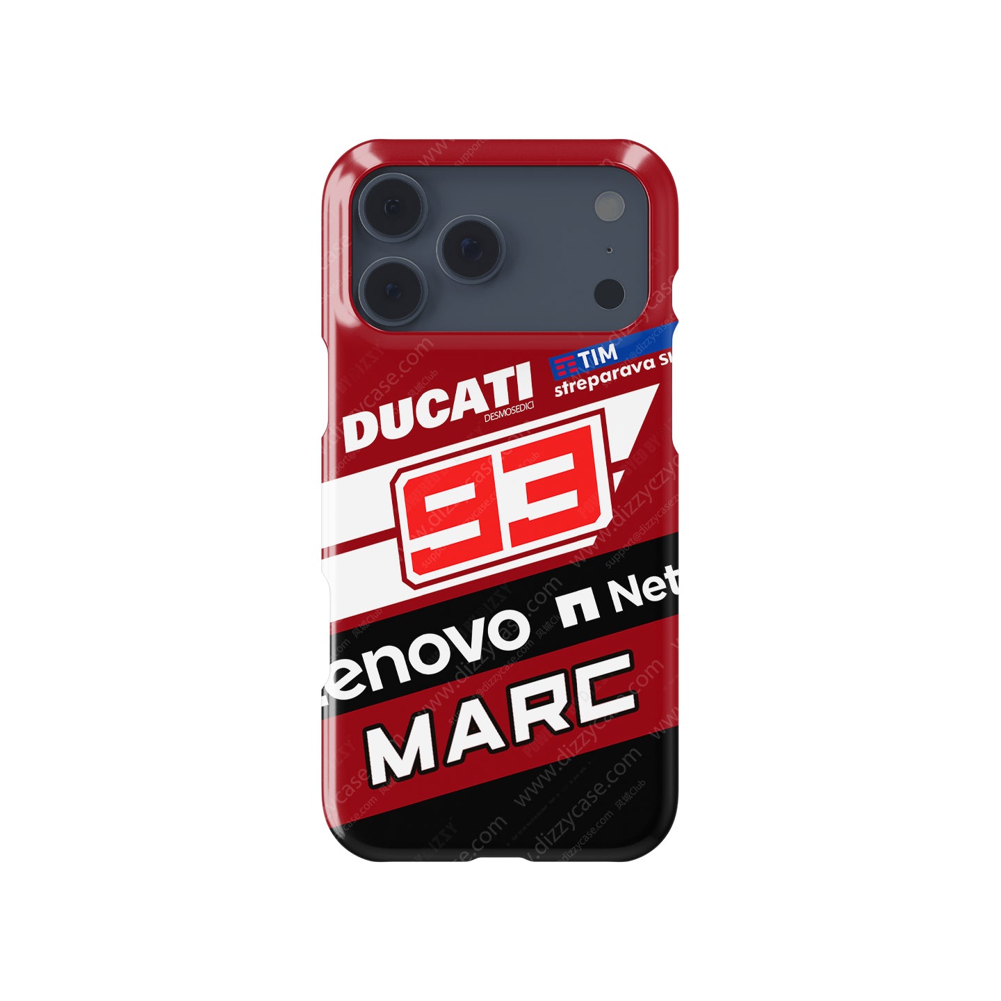 Based on the official team design, this case features the deep Ducati Red base, accented by the white Lenovo stripes. The hero of the design is the iconic #93, adapted to the factory font, and the bold "MARC" nameplate. It represents the ultimate fusion of Spanish talent and Italian engineering.