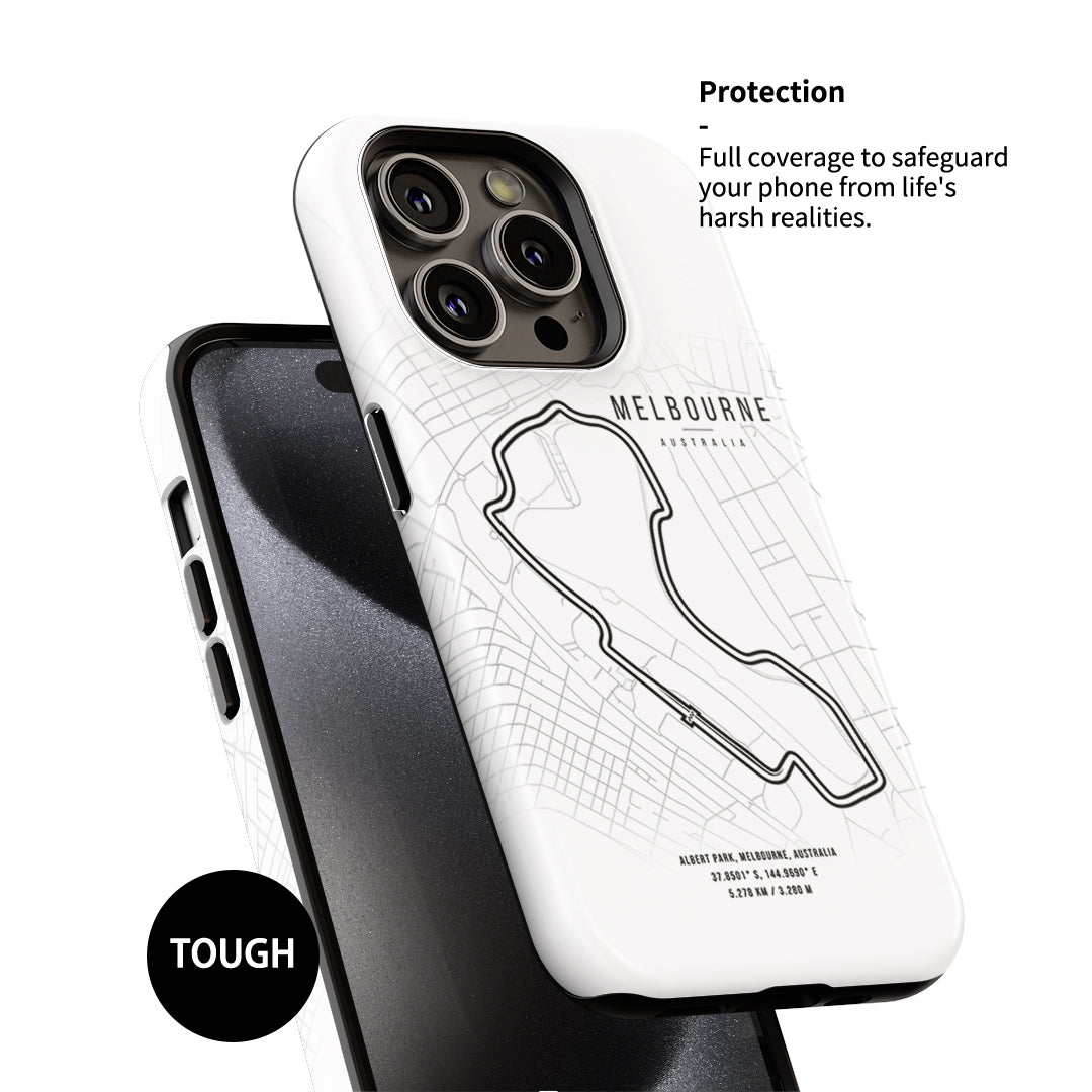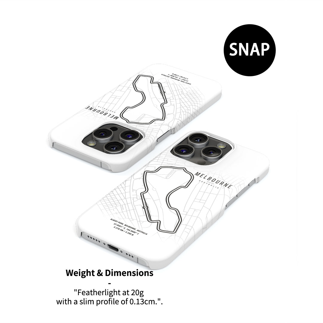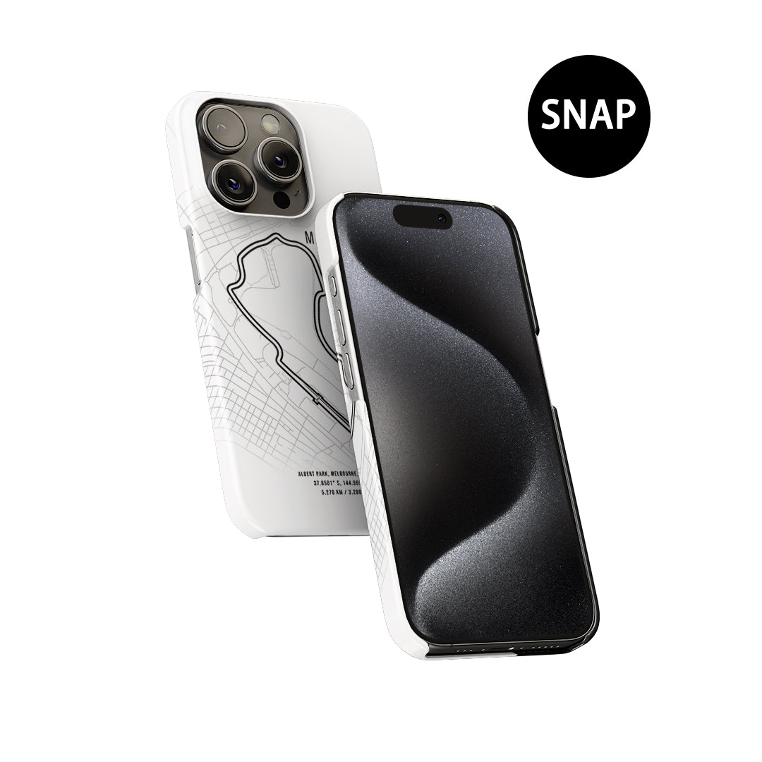 - Snap Case: For those who prefer a lightweight design without sacrificing protection, the Snap Case is the perfect choice. Made of high-quality polycarbonate, it offers a slim profile while displaying the detailed track map of the Melbourne Grand Prix. Protect your phone with racing style, all without the extra bulk.