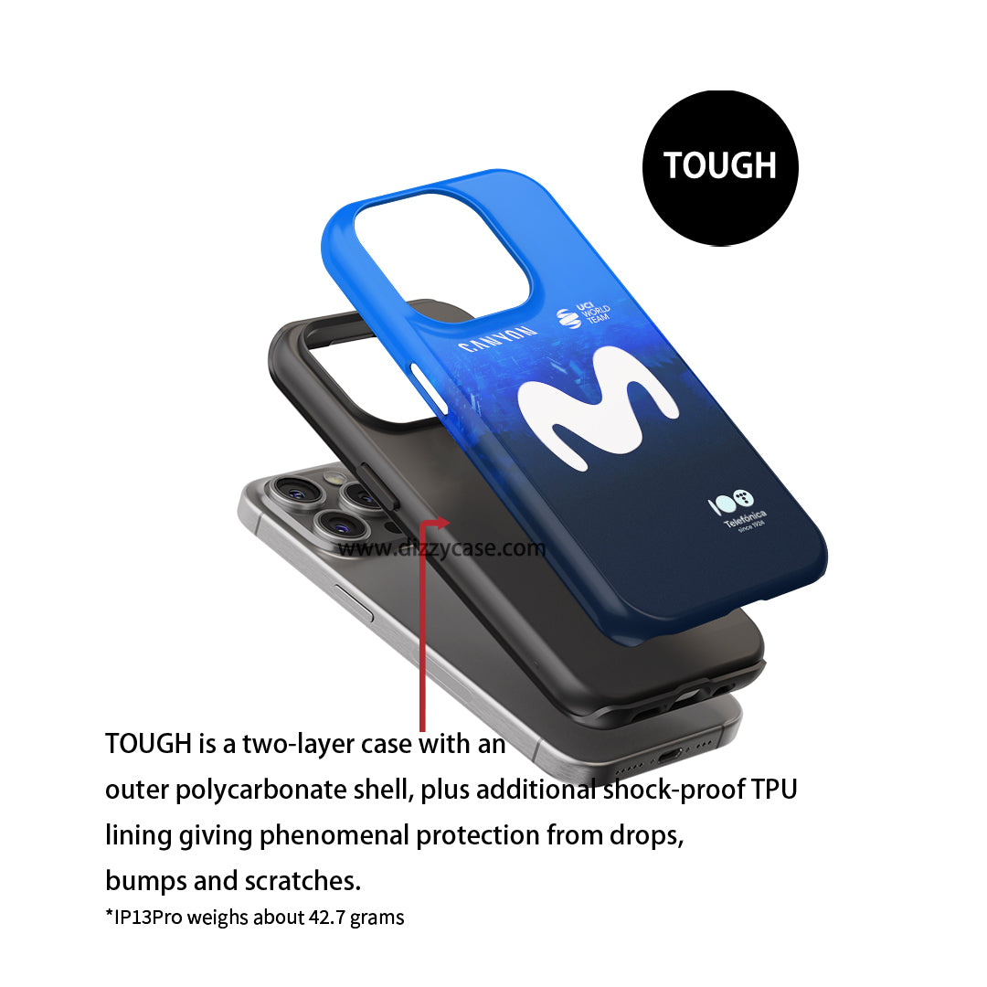 When life gets a little rough, you need a case that can handle the impact. That’s where our Tough Case comes in! Built with dual-layer protection, this case combines a shock-absorbing silicone inner lining with a tough polycarbonate outer shell to shield your phone from accidental drops and bumps. Whether you’re out on the road or just living your active lifestyle, the Movistar Team 2024 Cycling Livery Tough Case has your back. Plus, with raised edges to protect your screen and a design that wraps all around your phone, you get total protection without compromising on style. Now, your phone can race through life just as fast as you do!