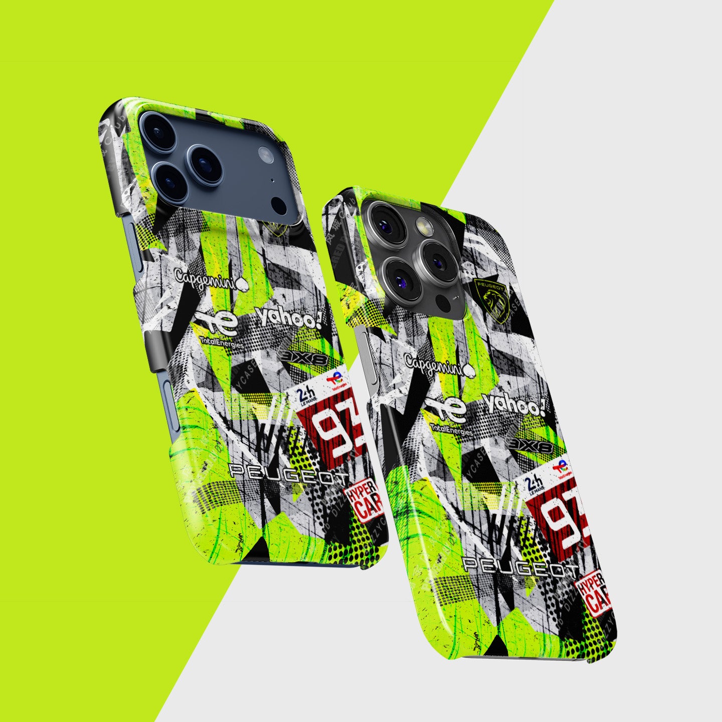 Based on Peugeot’s 2024 9X8 Hypercar, this phone case showcases the aggressive neon camo livery in its purest form — no number plates, no grime, just graphic power.
