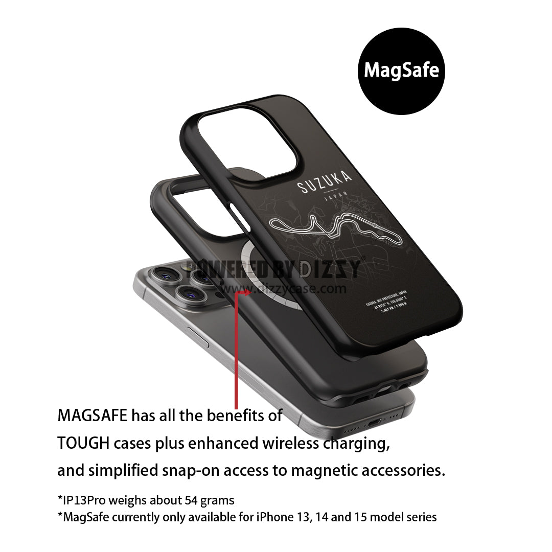 - MagSafe Tough Case (for iPhone 13 and later): For Apple users with a preference for seamless functionality, the MagSafe Tough Case adds compatibility with Apple’s MagSafe accessories. This case combines the same rugged defense as the Tough Case, featuring an extended silicone layer for screen protection while proudly displaying the Suzuka track map in full detail.